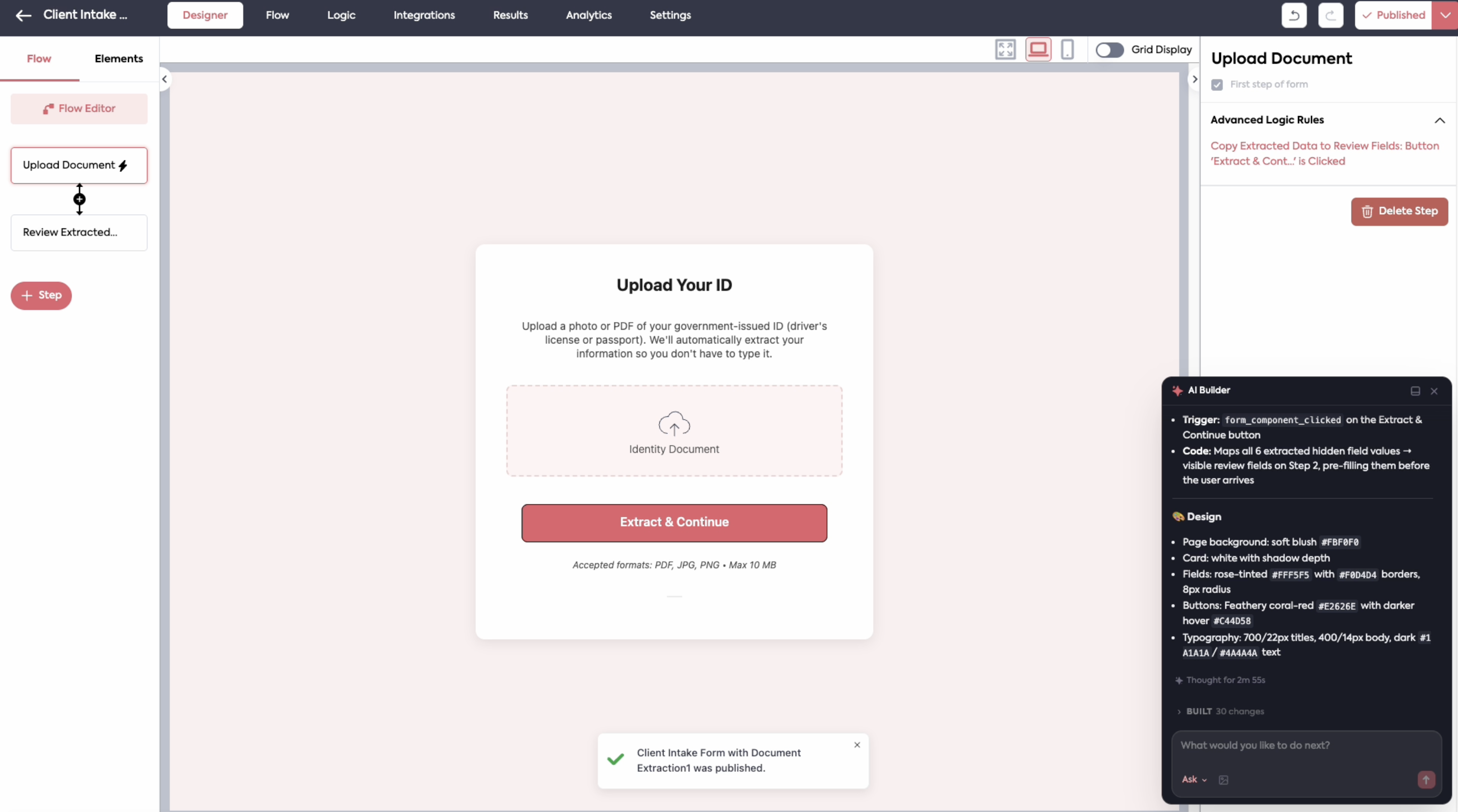 Build entire workflows using natural language. Describe what you need — forms, fields, logic rules, extractions — and the AI agent plans it out for your approval, then builds it step by step in real time. Also supports editing existing forms and a research mode for answering questions about your existing workflows.